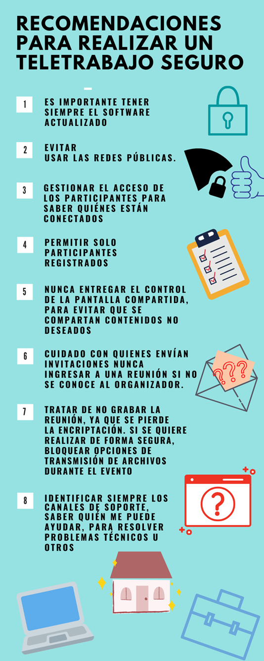 Además aquí pueden encontrar algunas recomendaciones para realizar videoconferencias de forma segura, estas recomendaciones están respaldadas por el CSIR (Equipo de Respuesta ante Incidentes de Seguridad Informática) del Gobierno de Chile: